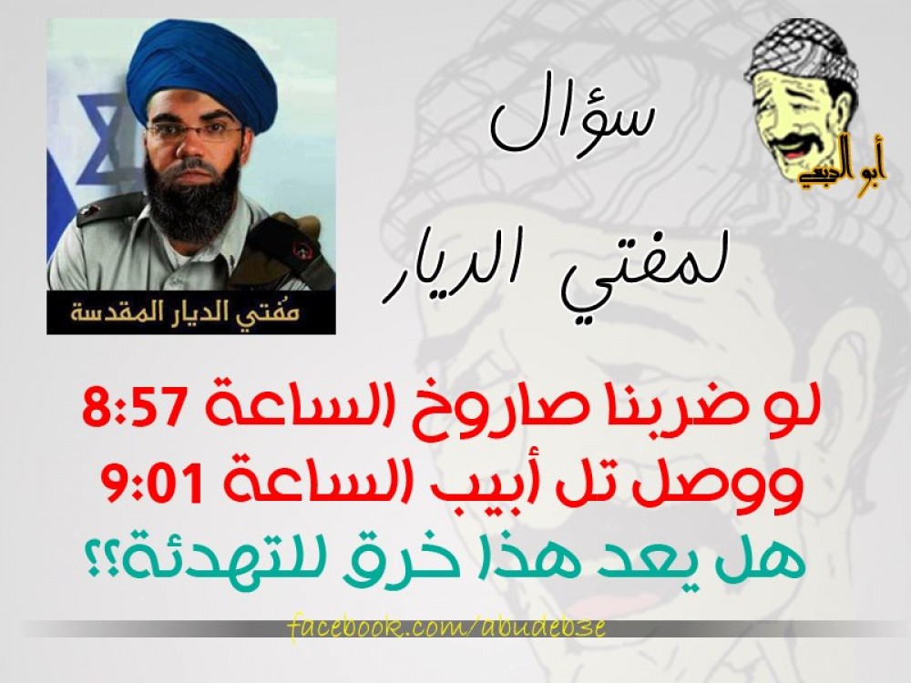 جاءت اللحظة الحاسمة، لحظة إعلان التهدئة في تمام الساعة التاسعة من مساء الأربعاء 21/11/2012، حيث حضّر "أبو الدبعي" نفسه لساعة النصر بتعليق ساخر انتشر كالنار في الهشيم على جدران الفلسطينيين الفيسبوكية، موجّهاً سؤالاً للشيخ أفيخاي أدرعي "لو ضربنا الصاروخ الساعة 8:57 ووصل تل أبيب الساعة 9، هل يعد هذا خرقا للتهدئة؟!"