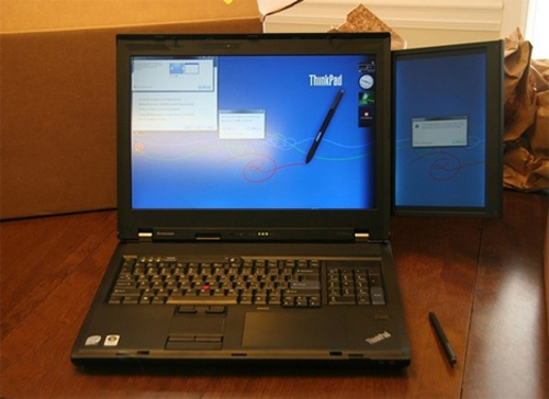 أما شركة لينوفو فقد طورت فكرة الشاشتين في جهازها "ThinkPad W700ds" لكن بشكل مختلف حيث صممت شاشة صغيرة بحجم 10.6 بوصة توضع خلف الشاشة الكبيرة التي يبلغ حجمها 17 بوصة وعندما يحتاج المستخدم لمساحة أكبر يقوم بإخراج الشاشة الصغيرة من خلف الأخرى والعمل بشكل طبيعي .