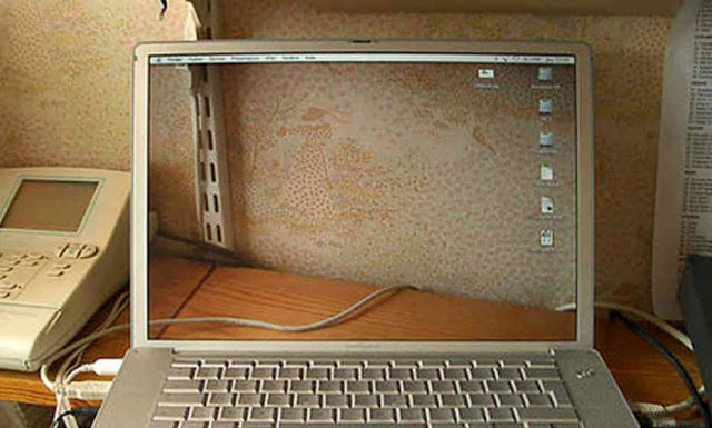 أولاً ضع جهاز الكمبيوتر الخاص بك سواء اللاب توب أو الجهاز المكتبي في مكانه الثابت، وقم بإغلاق شاشة اللاب توب وصوّر الجزء الواقع وراء الشاشة وضع مثلاً فيه علبة أقلام وأشياء أخرى، ثم خذ الصورة التي التقطتها وقم بقصها من خلال برنامج أي برنامج لتعديل الصور وقم بوضعها على سطح المكتب حينما تفتح الجهاز.