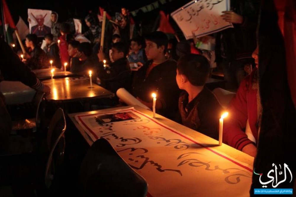 جلسوا على مقاعدهم الدراسية أمام منزل الرئيس محمود عباس في منطقة أنصار بغزة، مساء الأحد، في محاكاة منهم لصفوفهم المدرسية، وراحوا يذاكرون على أضواء الشموع.