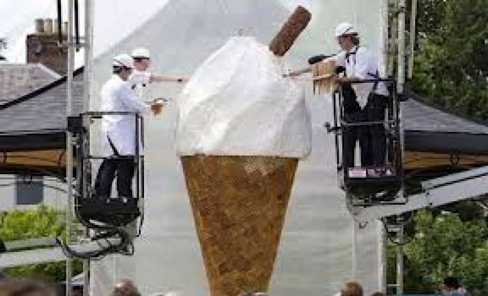تجمهر الآلاف من الأشخاص في حديقة غلوستر البريطانية من أجل مشاهدة إضافة اللمسات الأخيرة لإقامة أضخم وأكبر آيس كريم في العالم، من خلال وضع طبقة المنتج المثلج فوق "البسكويت".