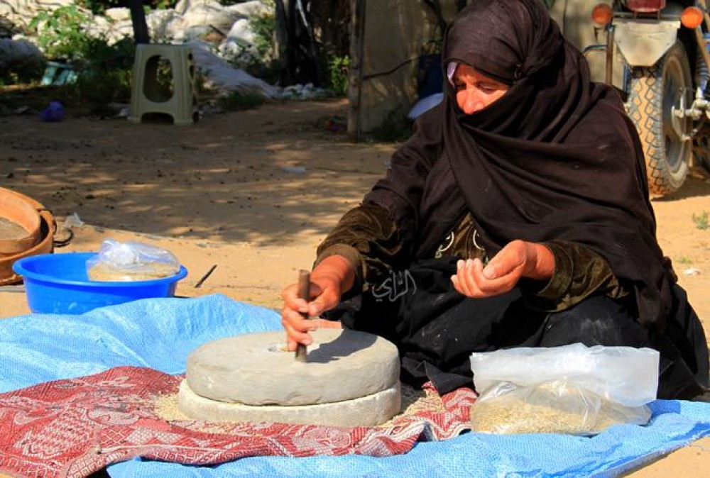 وتجلس الحاجة أم أحمد معمر ماسكة بيدها غربال عمره يزيد عن 40 عاماً صنع من القش تغربل بها الحبوب بعدما طحنها يدويا فتنخلها وتنقيها من القشور والشوائب لتختم الأسرة يومها الشاق المليئ بالعمل بوجبة من حساء الفريكة المطهي بالسمن البلدي.