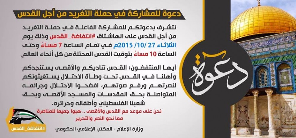دعا المكتب الإعلامي الحكومي - وزارة الإعلام، اليوم الثلاثاء، للمشاركة في حملة التغريد من أجل القدس على هاشتاق #انتفاضة_القدس، وذلك من الساعة السابعة مساءً وحتى العاشرة.