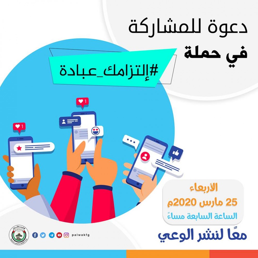 أعلنت وزارة الأوقاف والشئون الدينية عن إطلاق حملة بعنوان "التزامك عبادة" بالتعاون والتنسيق مع الإعلام الحكومي وشركاء آخرين اليوم الأربعاء, في تمام الساعة السابعة مساء, تتضمن الالتزام بالفتاوى الشرعية، بالقرارات الحكومية، بالإرشادات الوقائية في التعامل مع الوباء بشكل عام.