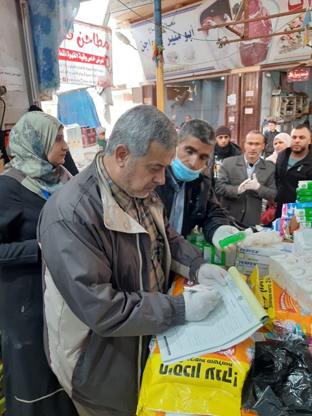 فيما قامت لجان التفتيش التابعة للوزارة بمتابعة وضبط أسعار المواد الغذائية والتموينية ومواد التعقيم والتطهير في الأسواق والمحال التجارية.