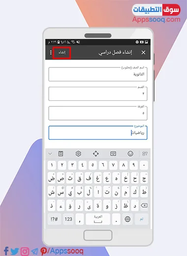 قم الان بملئ البيانات المطلوبة منك انت كمعلم، اسم الصف، القسم، الغرفة، الموضوع، ومن ثم اضغط على انشاء ، كما هو موضح بالصورة اسفل: