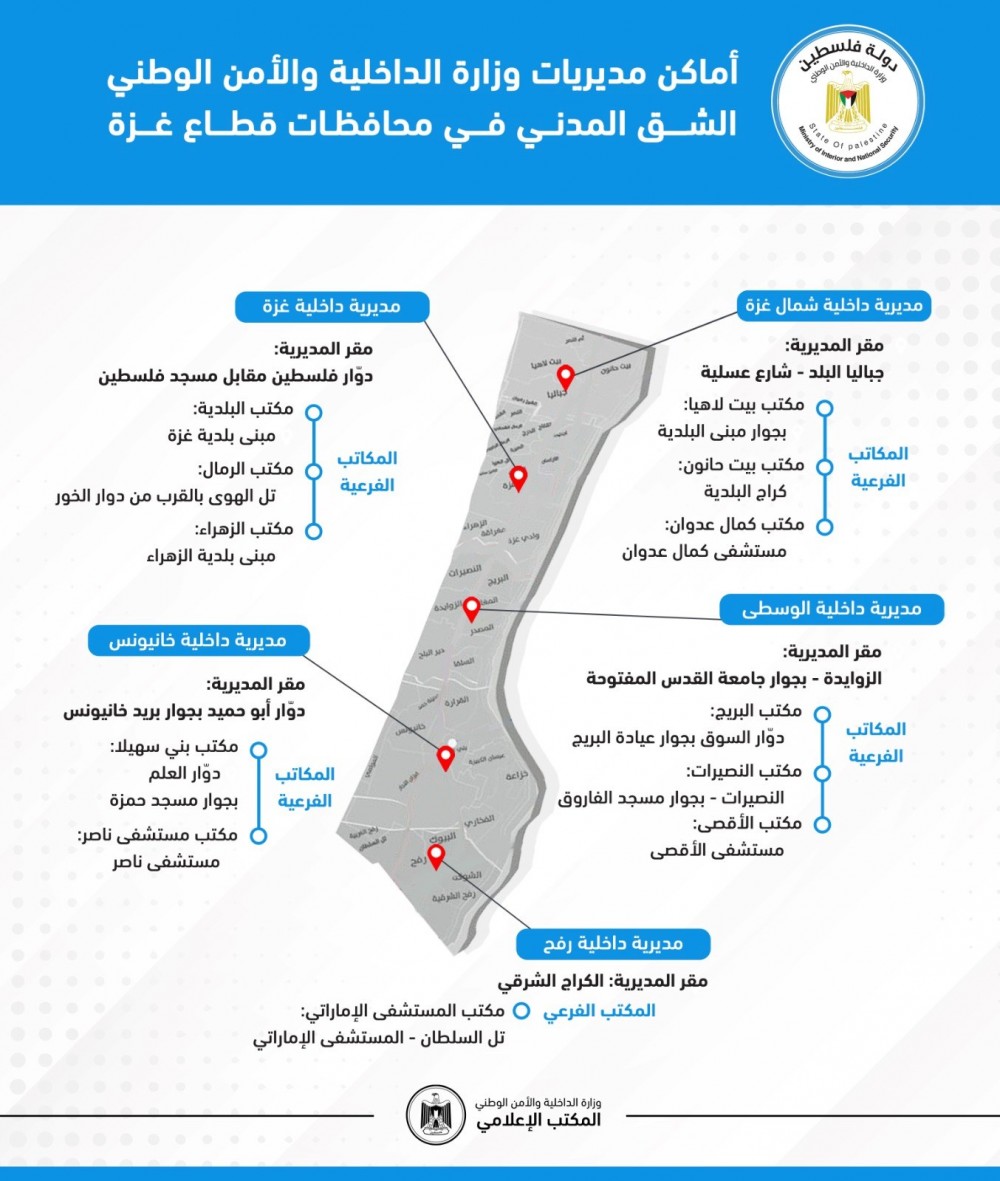 نشرت وزارة الداخلية والأمن الوطني – الشق المدني، تحديثاً لأماكن مقار مديرياتها في محافظات قطاع غزة، وذلك عقب إجراء تغييرات في بعض المحافظات مؤخراً في إطار إعادة البناء والترميم لتحسين جودة الخدمات للمواطنين.