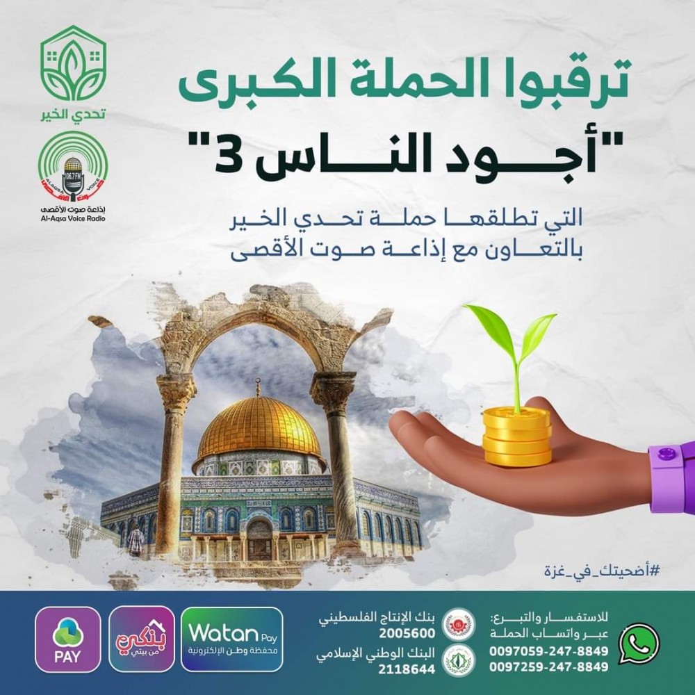 وفي الحملة التي أطلقتها، إذاعة صوت الأقصى تحت عنوان "أجود الناس"، تلقت الإذاعة اتصالاً من شاب كشف أنه باع سيارته بمبلغ 17 ألف دولار، وخلال بيعه السيارة تلقى اتصالاً هاتفياً بقبوله في وظيفة تقدّم لها في وقت سابق.