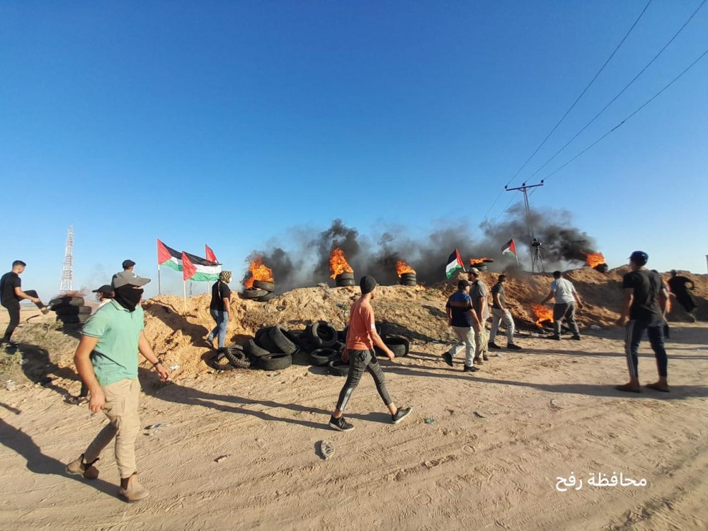 واحتشد العشرات من الشبان الغاضبين، قرب السياج الحدودي لمدينة رفح وخانيونس وجباليا، حيث قاموا بإشعال الإطارات المطاطية ورفع علم وفلسطين ورشق الجنود القريبين من السياج بالحجارة.