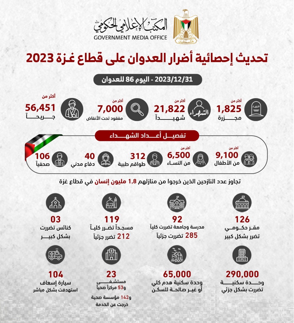 نشر المكتب الإعلامي الحكومي الحكومي، تحديثاً لأهم الإحصائيات المتعلقة بالحرب "الإسرائيلية" الوحشية على قطاع غزة – الأحد 31 ديسمبر 2023م.